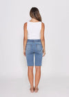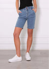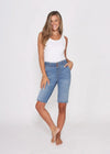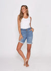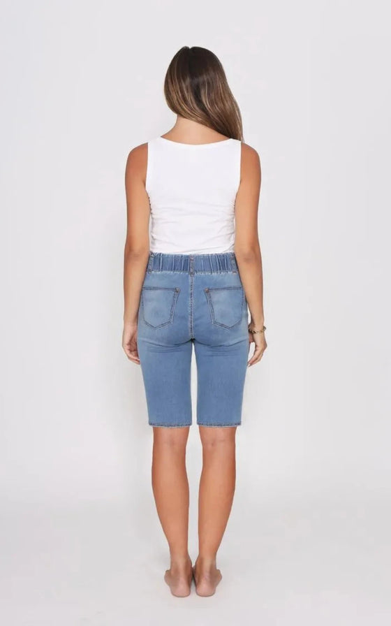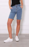 Introducing our Alana midi length denim shorts, designed specifically for busy mums. These shorts are the perfect combination of style, comfort, and functionality, making them a must-have addition to your wardrobe. The midi length provides just the right amount of coverage, ensuring a modest yet fashionable appearance. One standout feature of these shorts is the elastic waistband, guaranteeing a comfortable and secure fit.