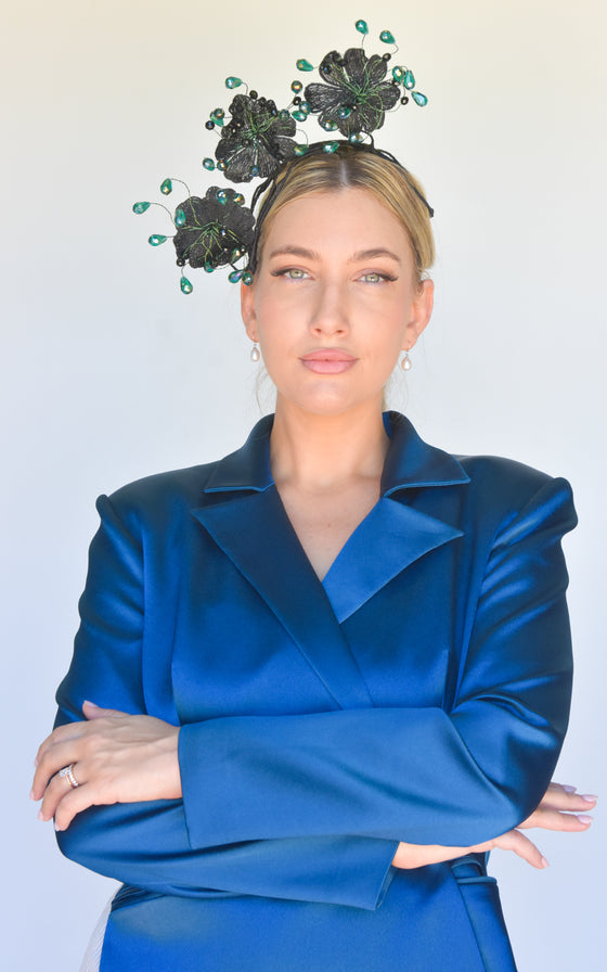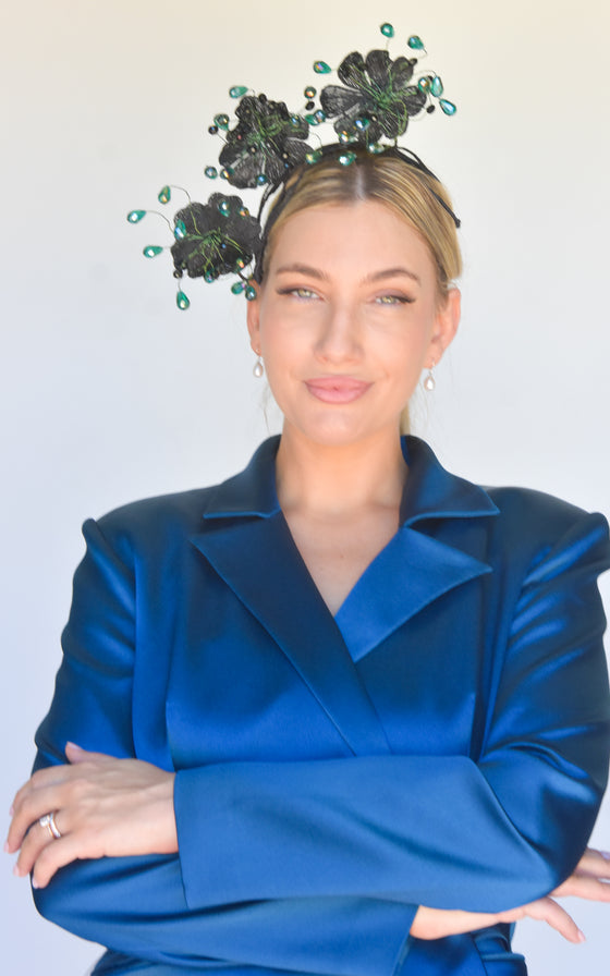 Easy to wear secured on a headframe with comb. This is a perfect piece for a Spring/Summer event or race day. One off creation handmade with love by the Sonlia team.Made in Australia