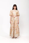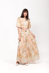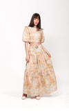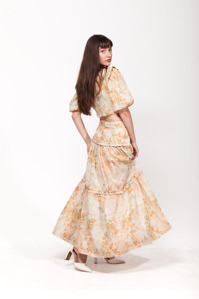 The Azalea Maxi Skirt in the custom Orange Floral Print from the Linen Edit. A 100% linen maxi skirt featuring a flounce hem, an invisible zipper and a removable belt.