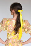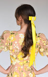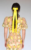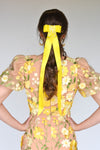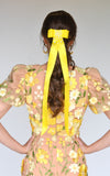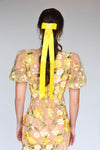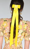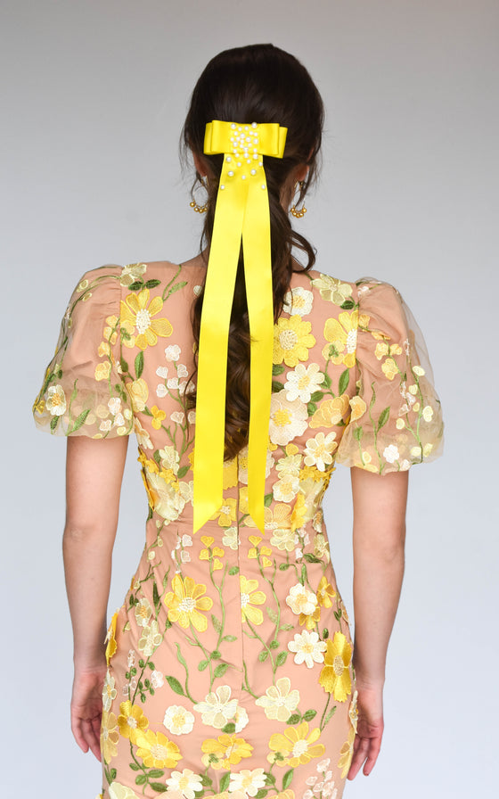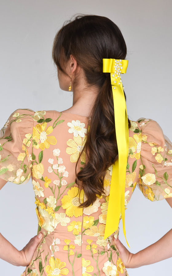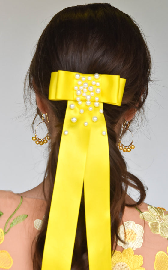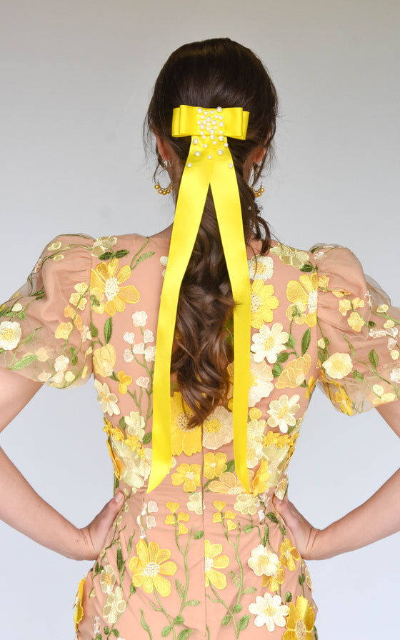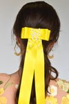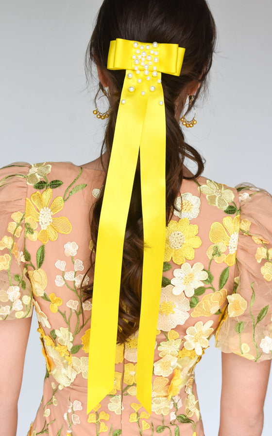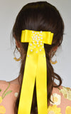 Satin ribbon bow with long tails and hand beaded embellishment.