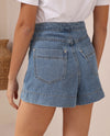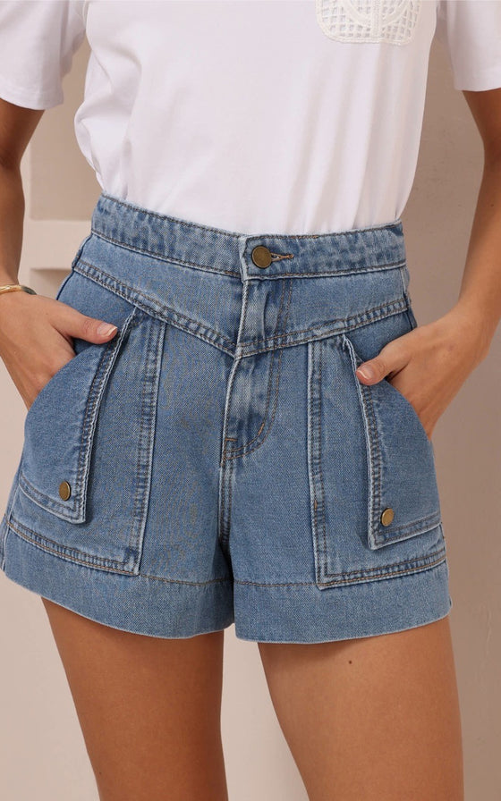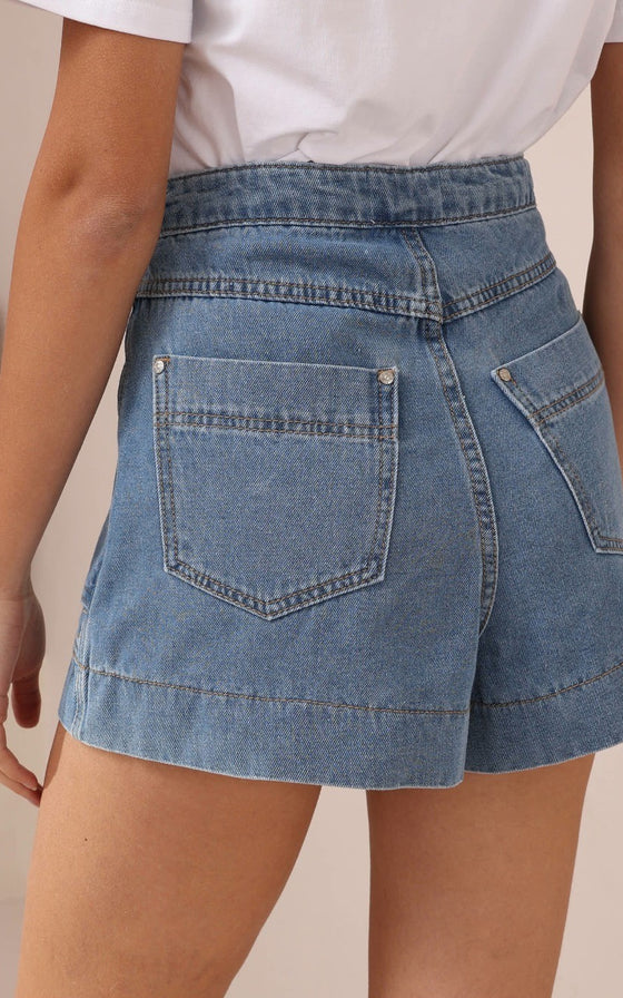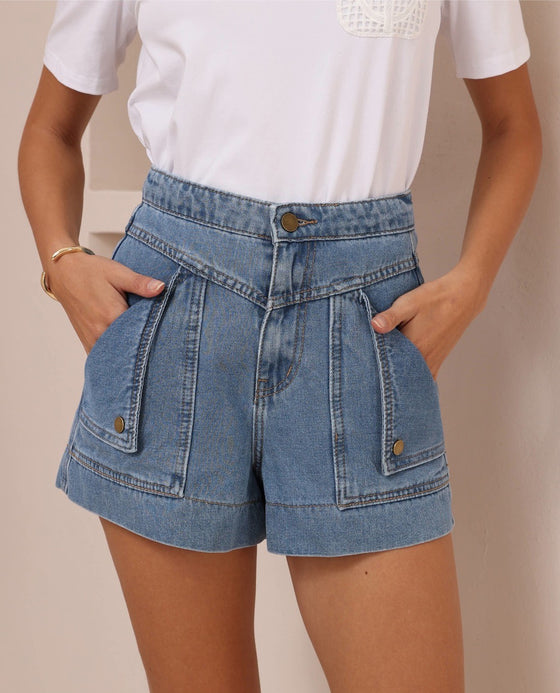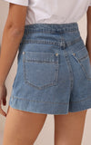 The Carmen Denim Shorts in features contrast topstitching and panel detailing, front fold over pockets, complete with brass hardware.No stretch in fabric.