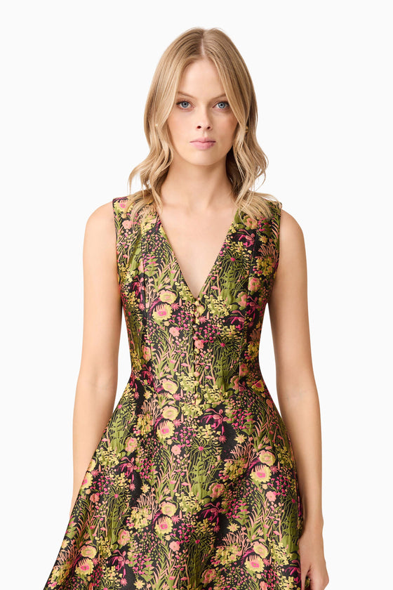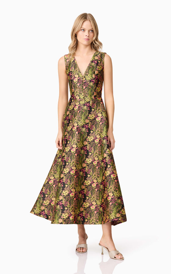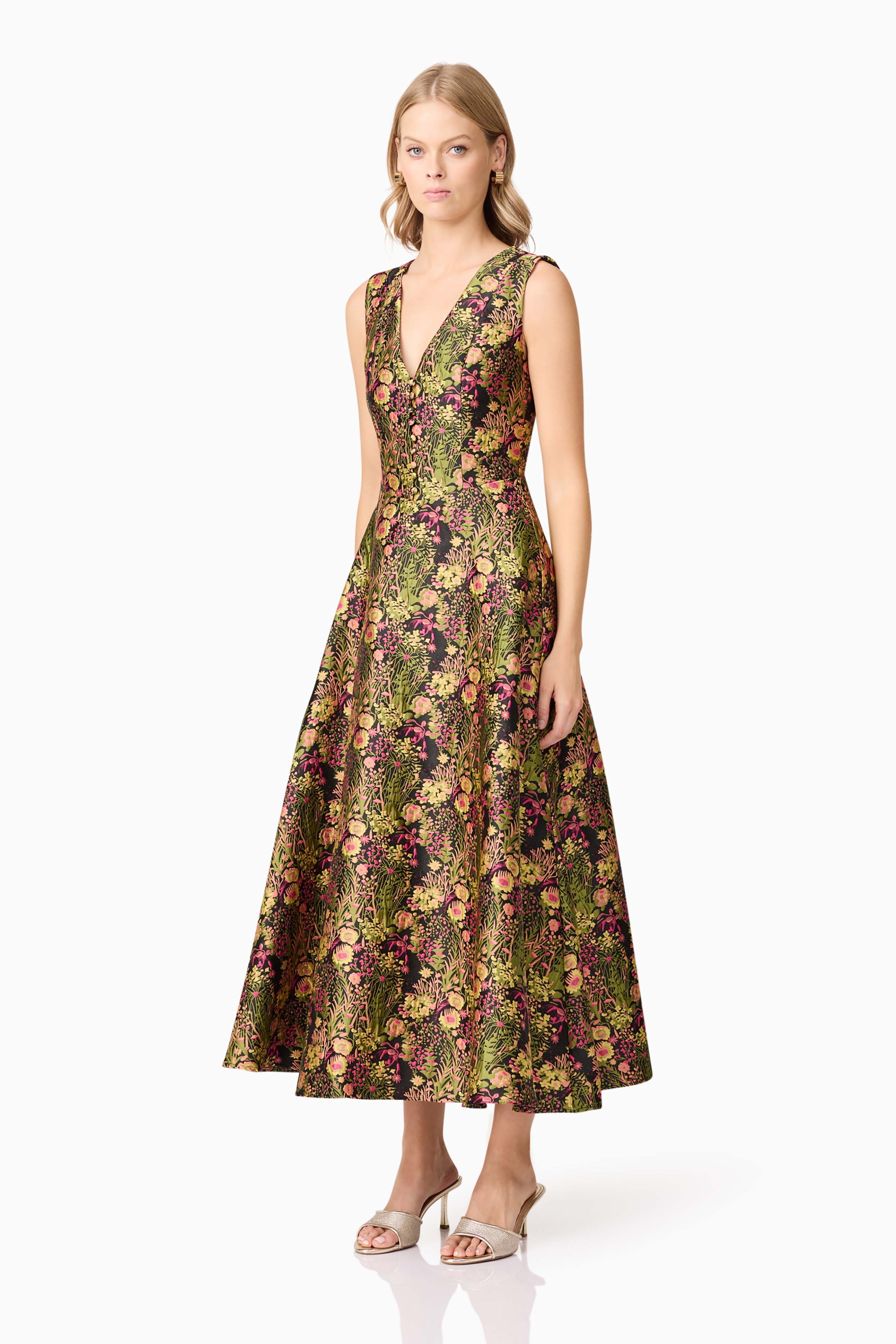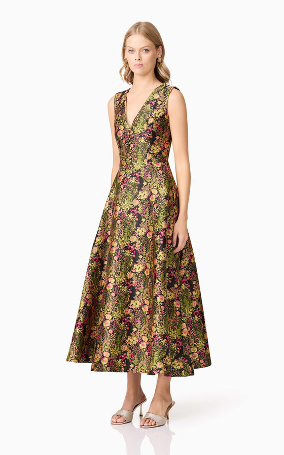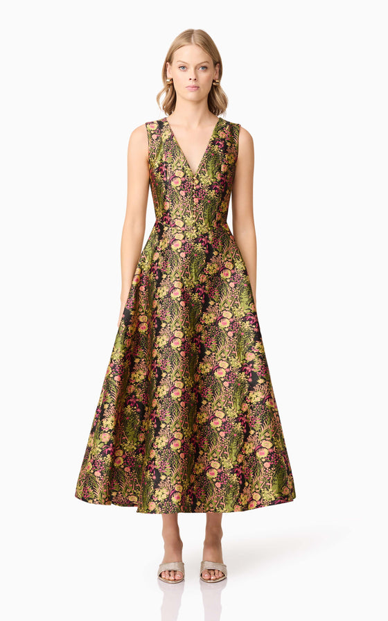 Embrace effortless elegance with the Cindy Gown in Floral, a stunning maxi dress designed for timeless sophistication. Featuring a flattering V-neckline, this gown highlights the décolletage while offering a refined and feminine touch. The fit and flare style cinches at the waist before flowing into a voluminous full skirt, creating a graceful and romantic silhouette.