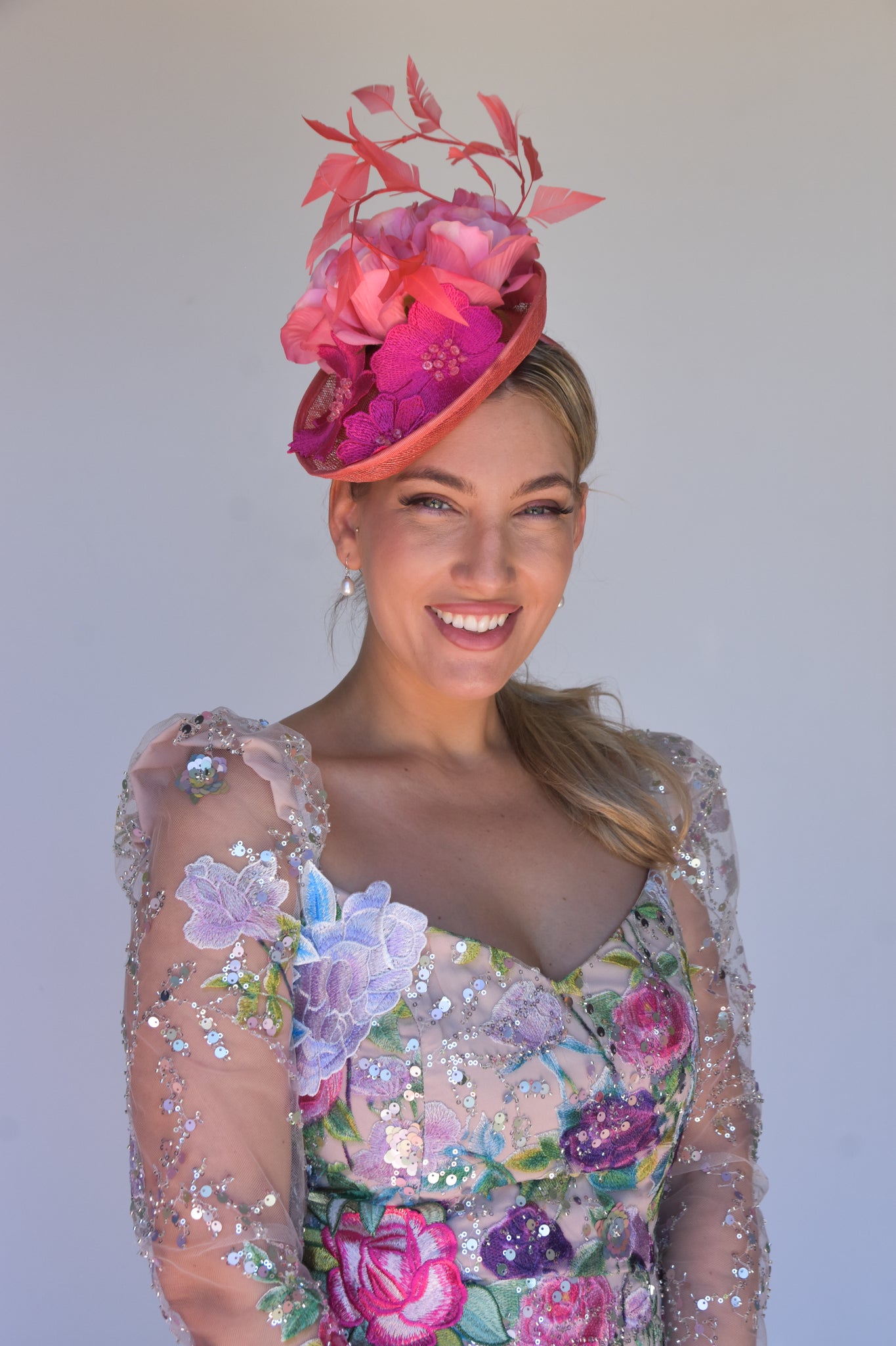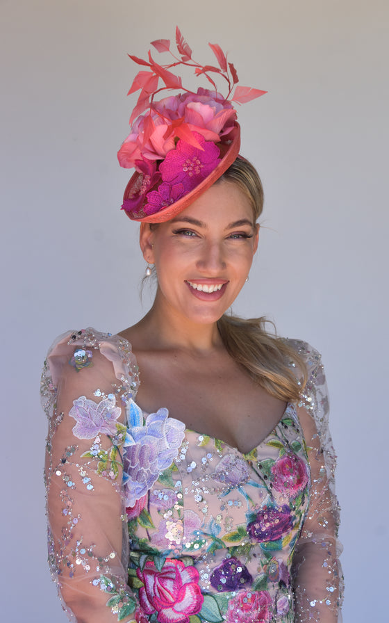 Easy to wear secured with a headband and comb. This is a perfect piece for a Spring/Summer event or race day. One off creation handmade with love by the Sonlia team.Made in Australia