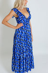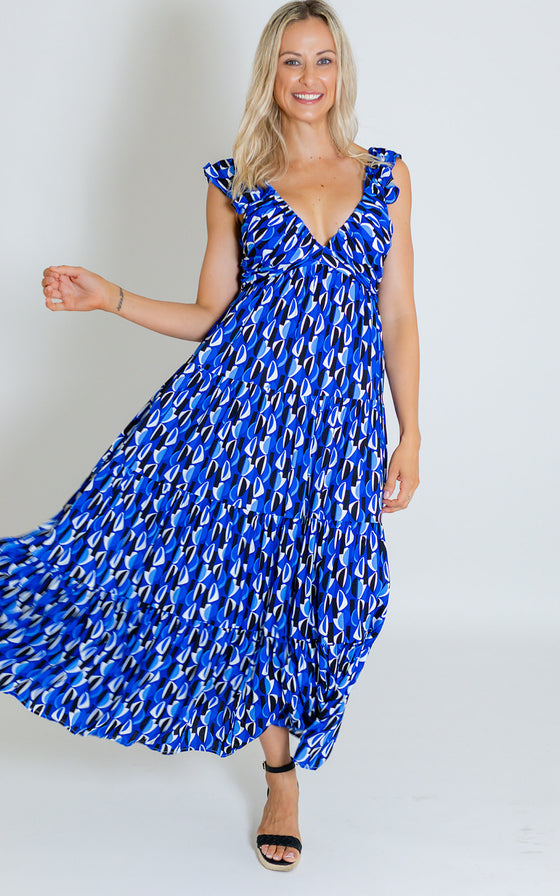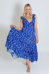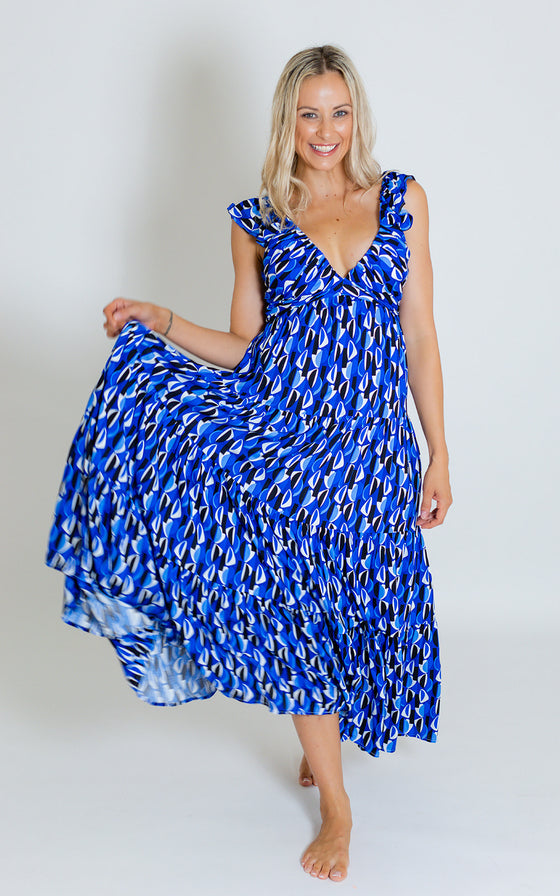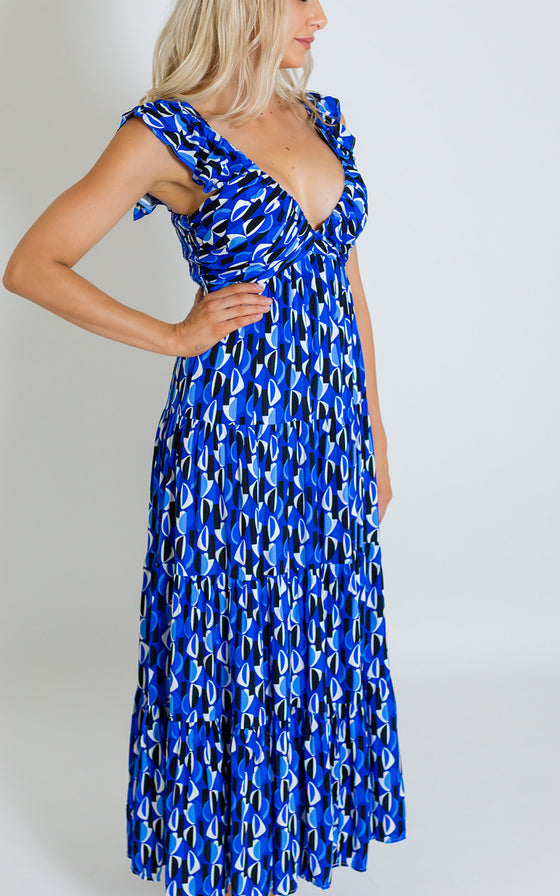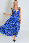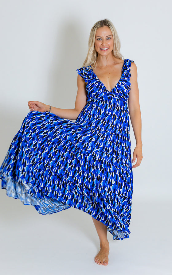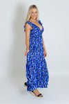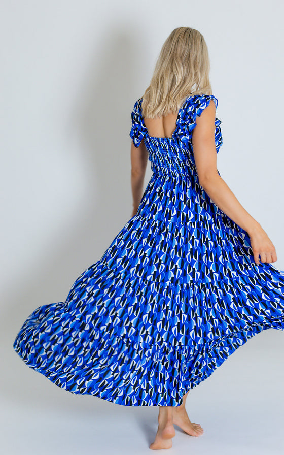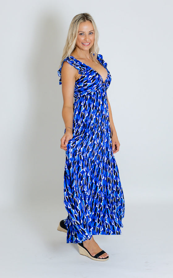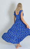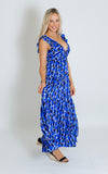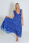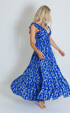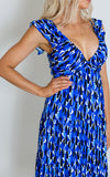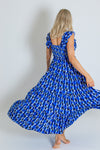 Be the belle of the ball in our EDEN MAXI DRESS! This stunning blue dress features a deep v neck, fully lined for comfort, and frilled sleeves for a touch of playfulness. With shirred elastic on the back for added stretch, think garden parties, baby showers, lunch dates & picnics.
