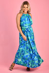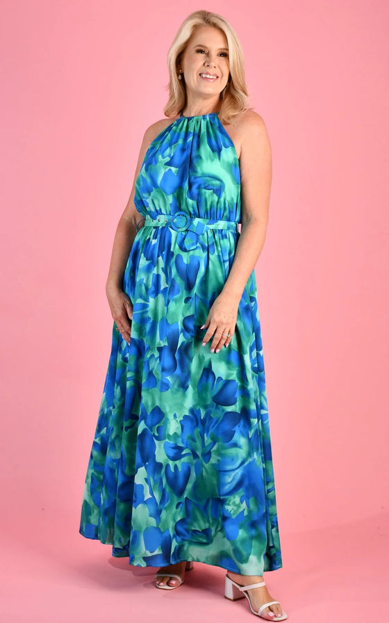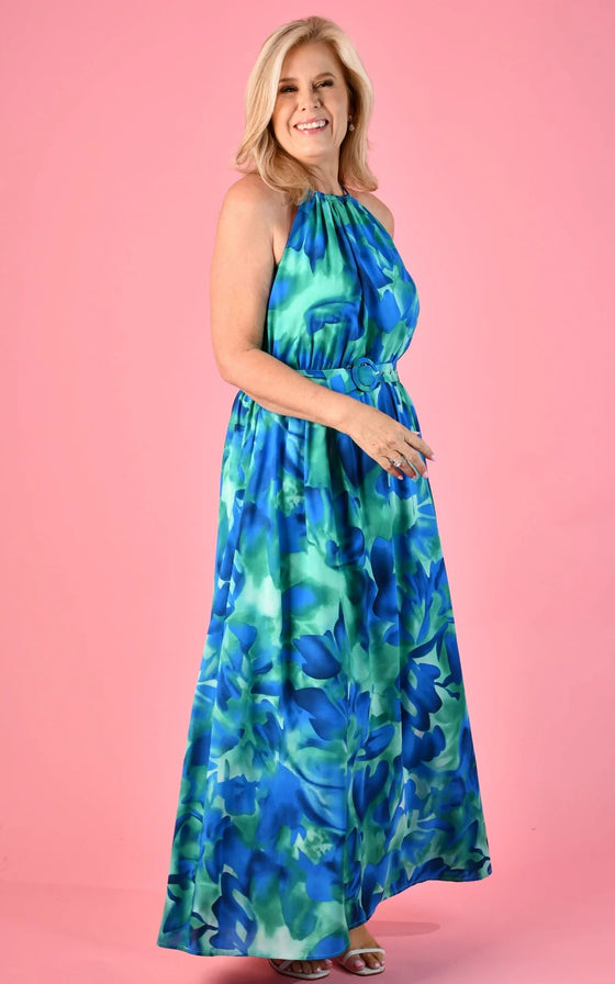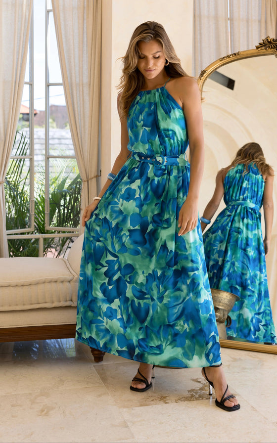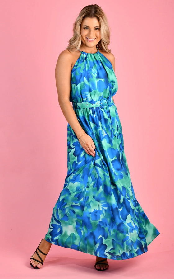 With a gorgeous halter neckline and belt this dress falls beautifully! This versatile maxi dress is a must-have in any wardrobe!
