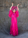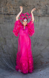 Encasing the dress is a sheer outer layer crafted from fine tulle, flowing softly with every movement. Hand-finished tulle ruffle detailing creates sculptural texture throughout the garment, complemented by delicate lace accents and individually hand-stitched rhinestones that catch the light with quiet elegance.