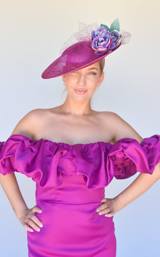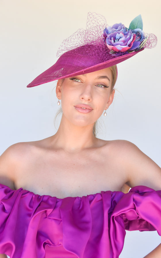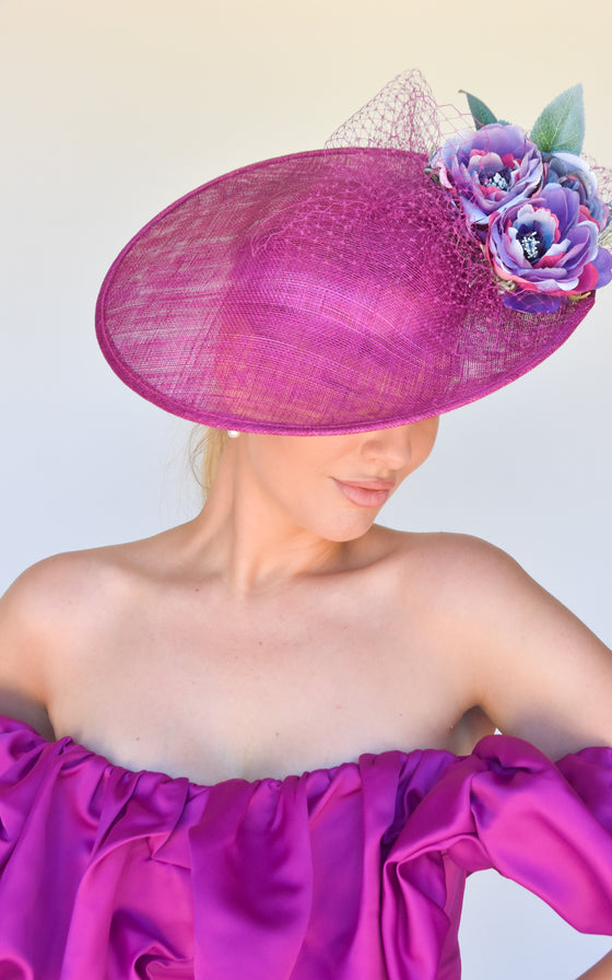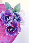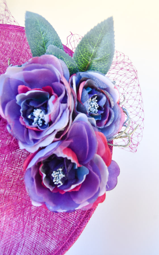 Sinamay Hat on headband with flowers and veil.