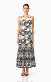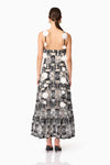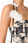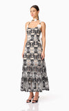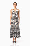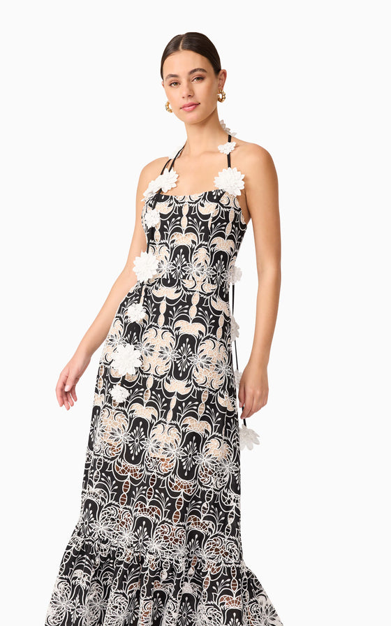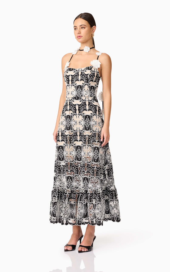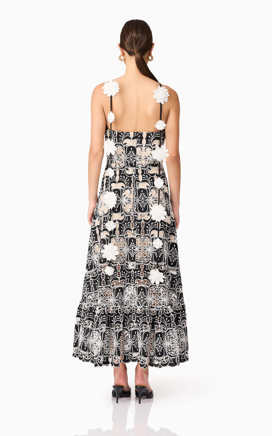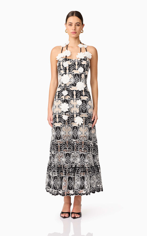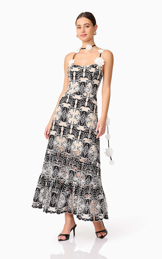 The Jolie Floral Midi Dress in Black is an elevated take on romantic occasion wear. Crafted from a luxe monochrome embroidered crepe fabrication, this A-line midi dress features intricate floral embroidery in crisp white, layered over a rich black base for a striking contrast.