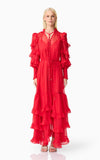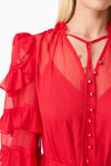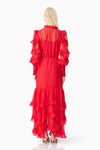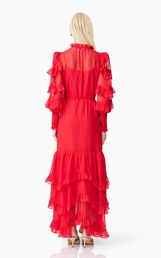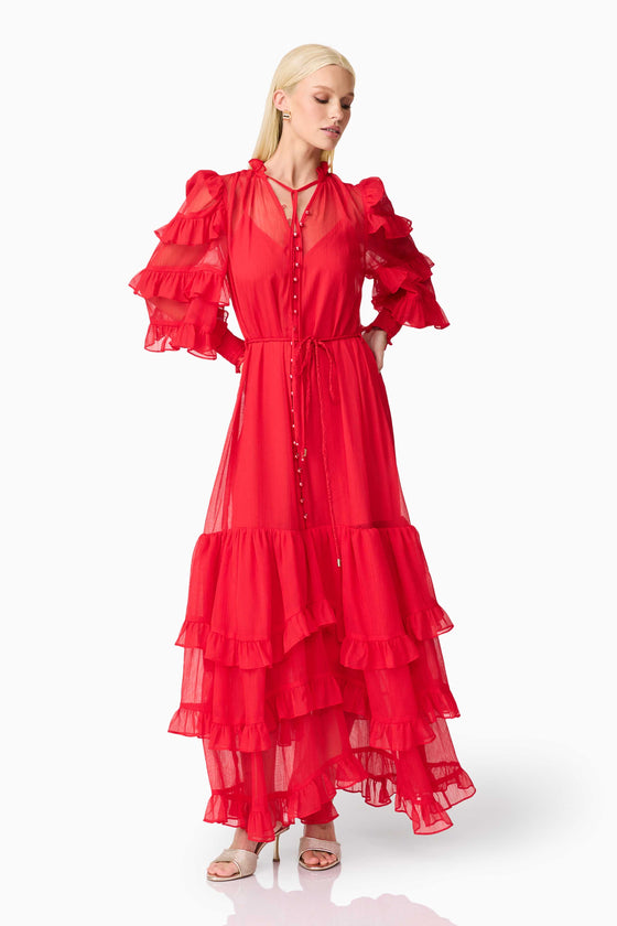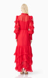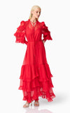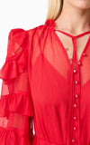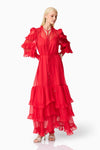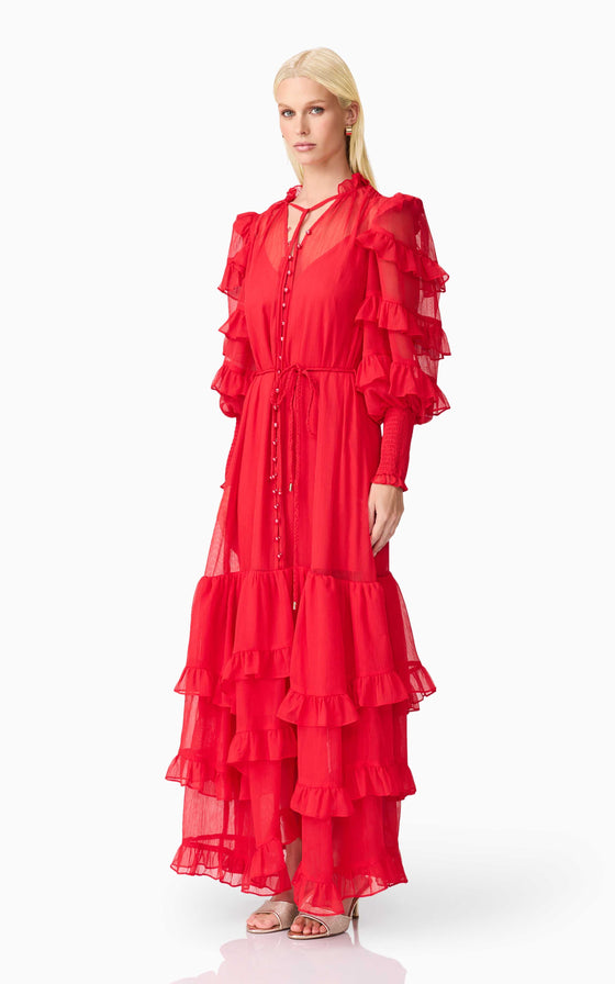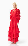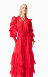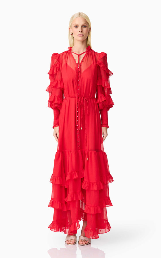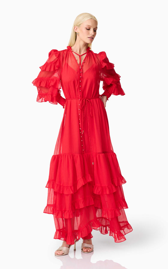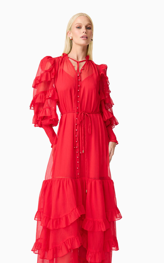 A flattering V neckline is accented by a centre front button closure, adding a touch of vintage charm to the silhouette. The long blouson sleeves are finished with elasticated cuffs and delicate frill detailing, bringing volume and softness to the design. At the hem, tiered frills add shape and dimension, enhancing the dress’s fluid feel.