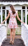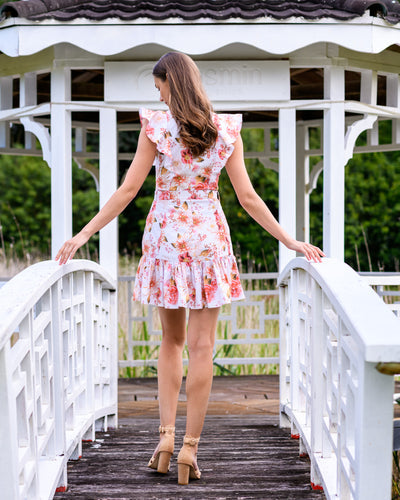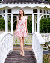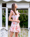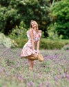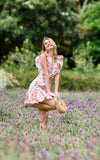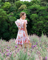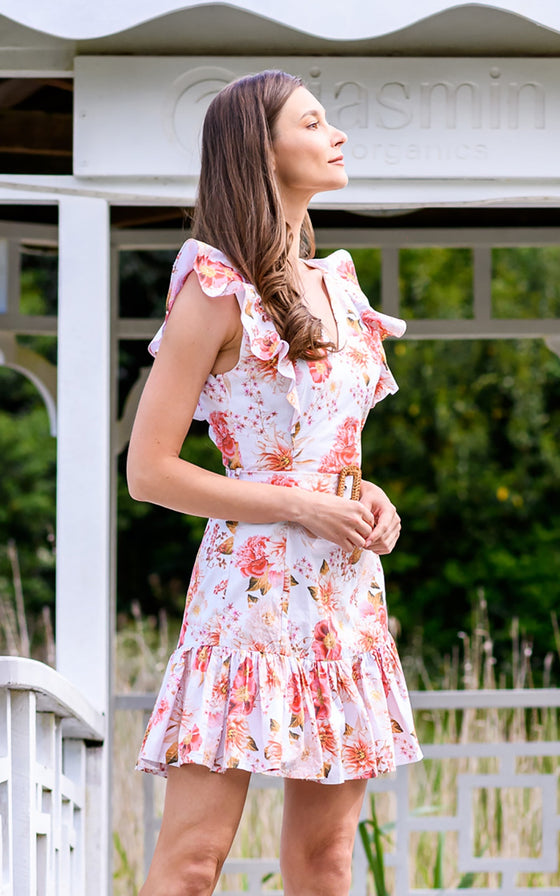 The Lily Dress in the custom Dreamy Days Floral Print from our 2023 Bloom Collection. An organic cotton mini dress featuring a flounce hem, V neckline and a removable belt.