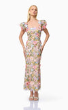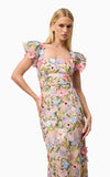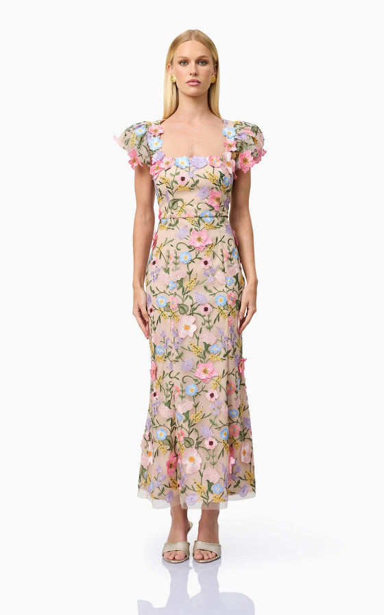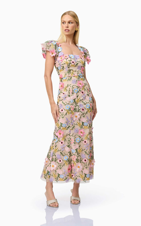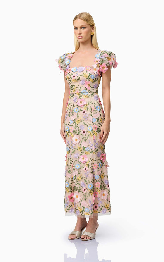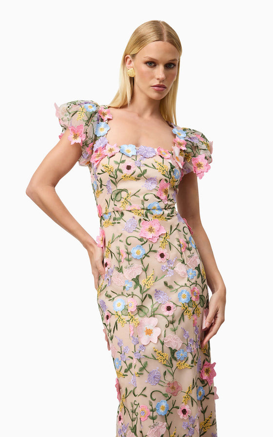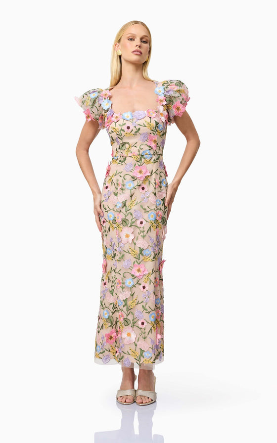 The Nydia 3D Maxi Dress is a stunning floral design inspired by the best-selling Astraea silhouette. This puff-sleeve midi dress exudes timeless elegance, perfect for weddings, formal events, or any special occasion where you want to shine. Featuring a straight neckline, the dress offers a sophisticated and modern look, while the fitted style accentuates your figure beautifully. Crafted with intricate 3D lace fabrication, the design adds a dimensional and romantic touch, making it a standout piece in any wardrobe.