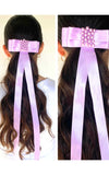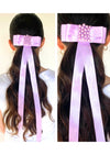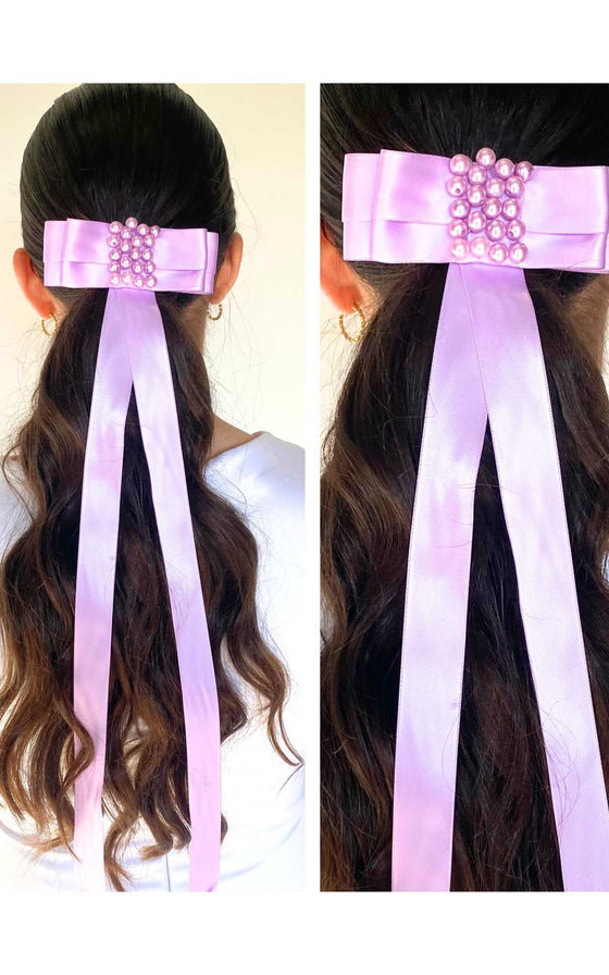 Satin ribbon bow with long tails and hand beaded embellishment.