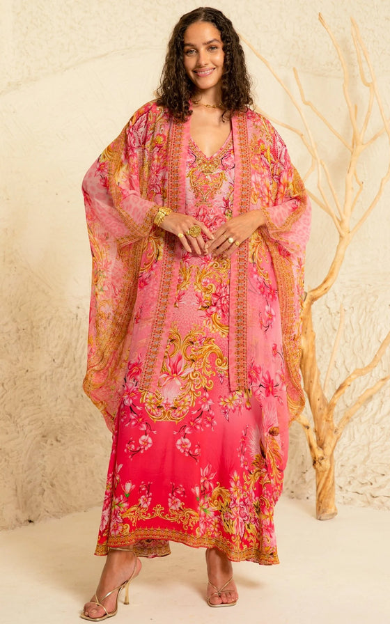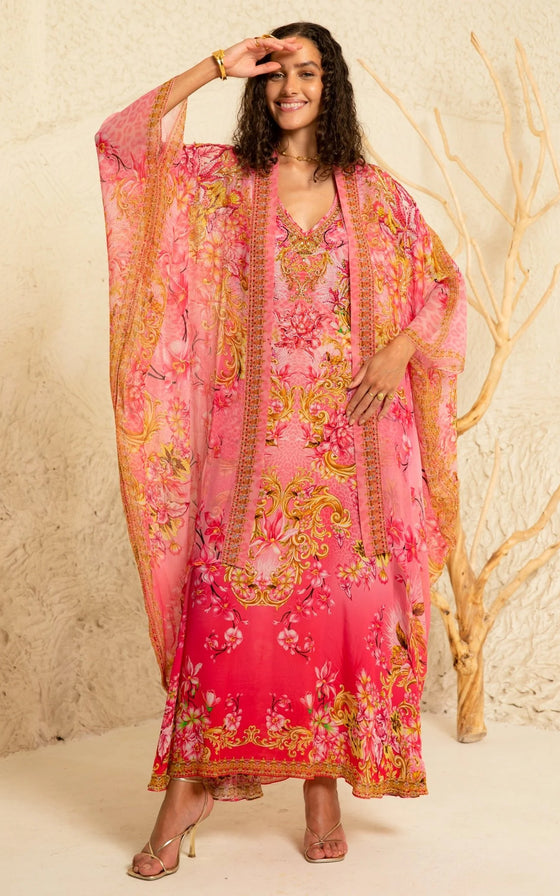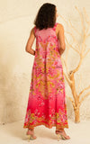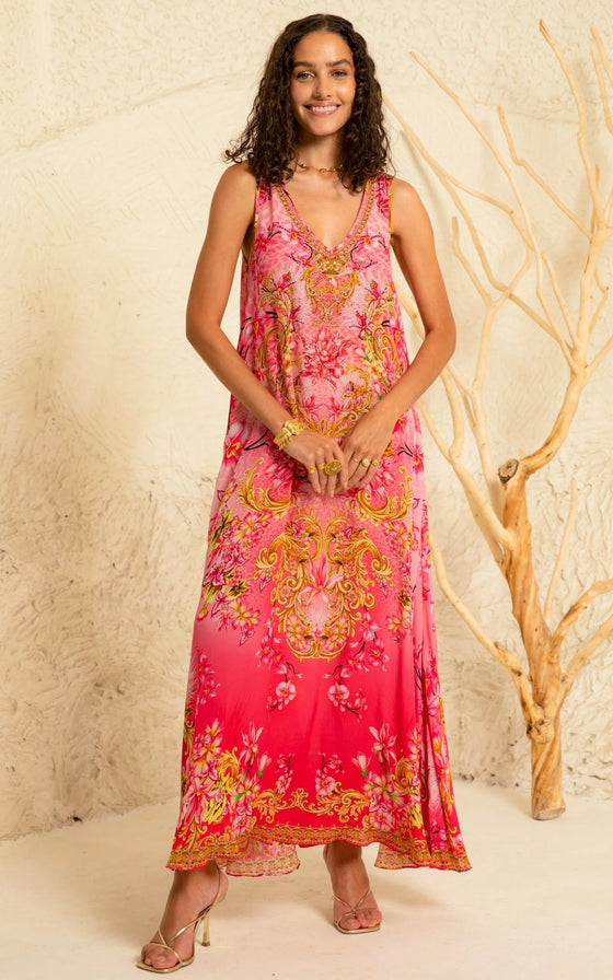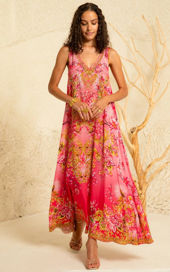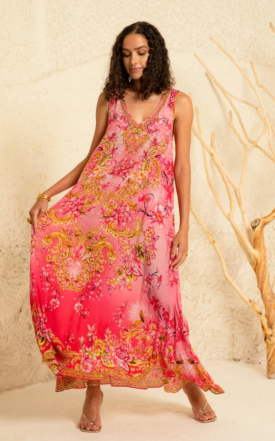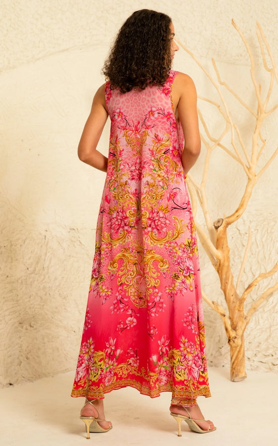 Get ready to turn heads with our Pink Candy Sleeveless Dress! This V-neck maxi dress is designed to flatter with its A-line silhouette and relaxed fit. The thick straps add a touch of comfort, while the hand-embellished crystals give it a stunning, eye-catching look. Perfect for any occasion!