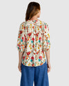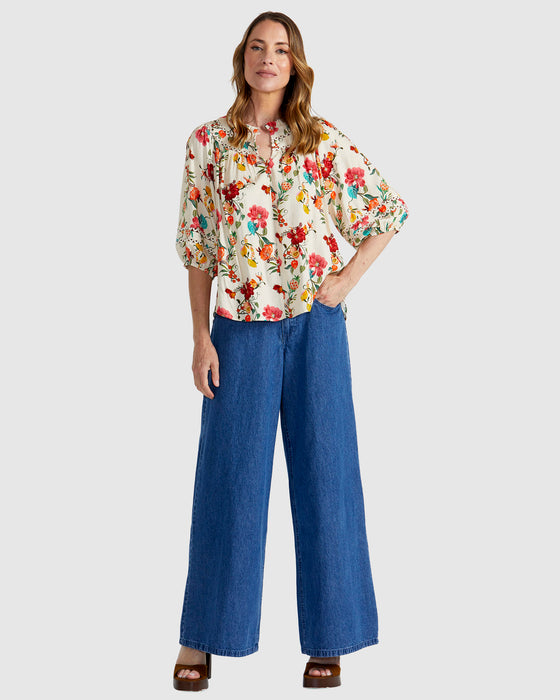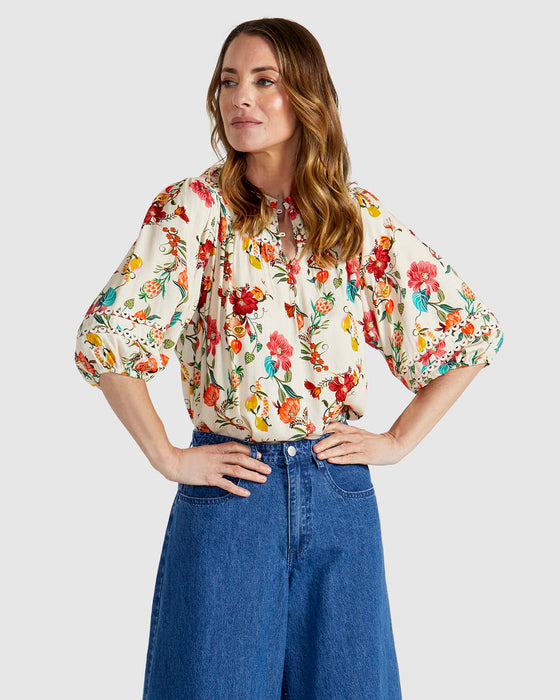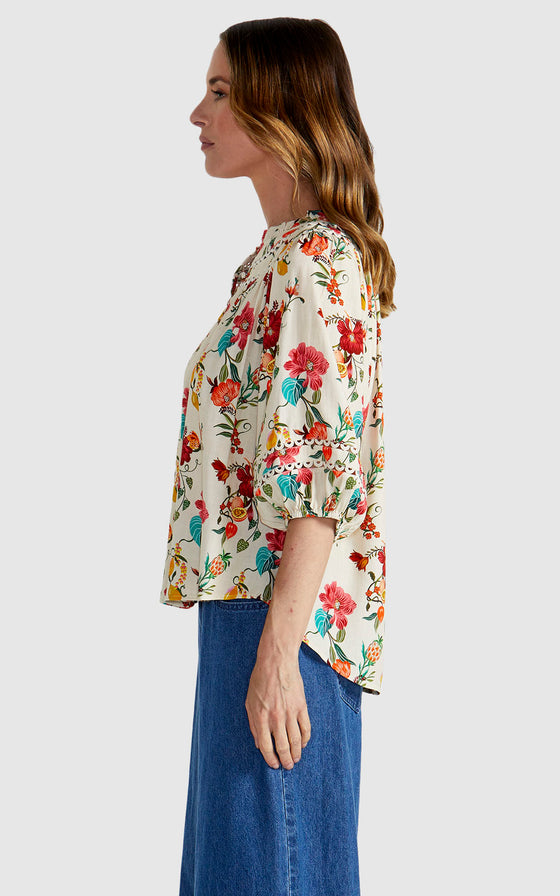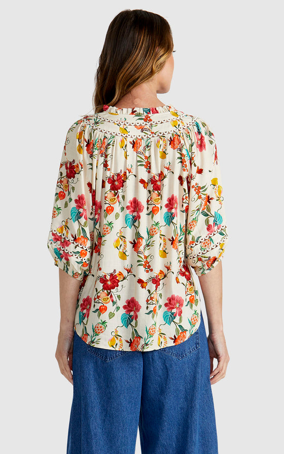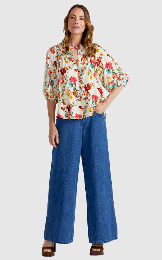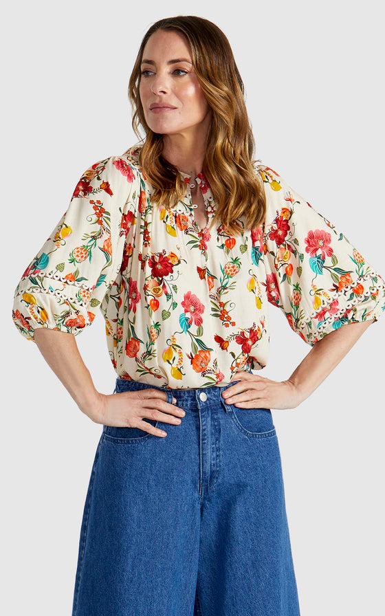 Featuring oversized puff sleeves with ladder trim detail, the Guadalupe Top is a sophisticated, winter-ready piece. A front keyhole opening with button closures and frill detail at the collar elevate its classic design, offering a polished, relaxed fit for the discerning woman.