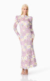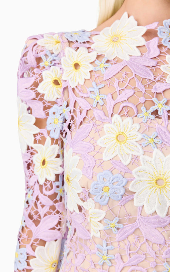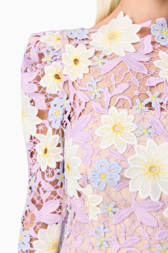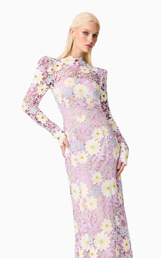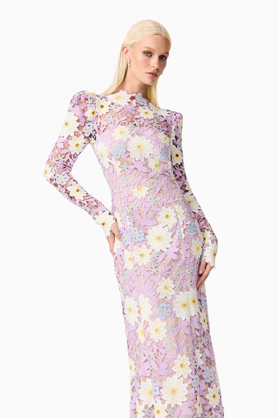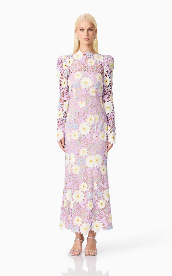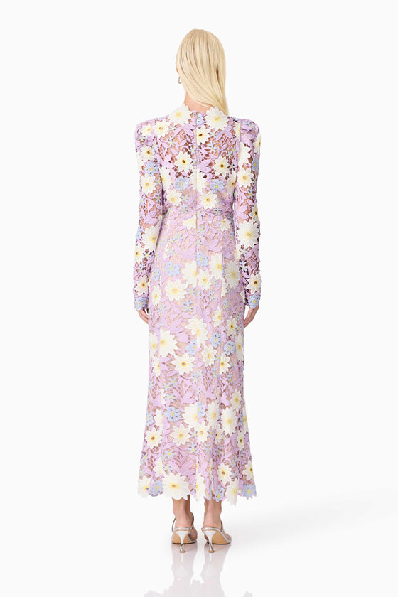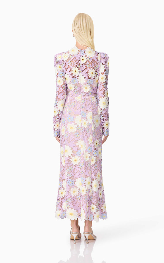The Sigrid Midi Dress is a stunning and feminine choice, perfect for any special occasion. This dress features beautifully crafted embellished floral lace with pastel flowers that create a striking contrast. The floral placement varies with each dress, ensuring that each piece is unique.