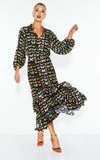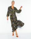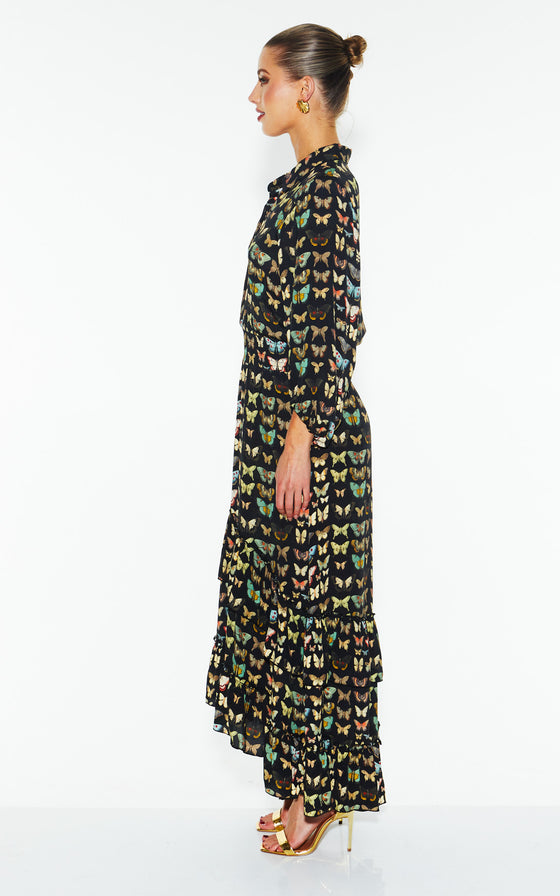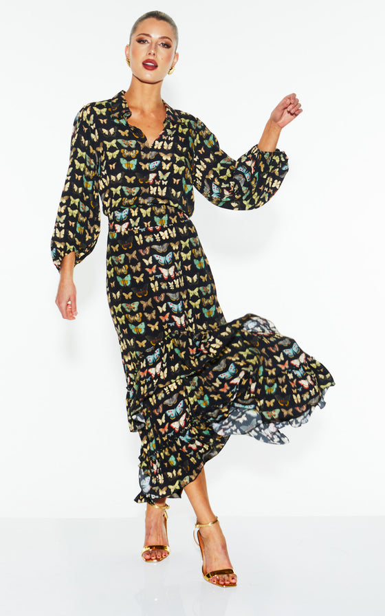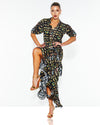 The Taking Flight Shirt Dress features a refined springtime design with elastic shirring at the waist and elbow-length puff sleeves. The high-low hem and frill detail create a relaxed, elegant silhouette.