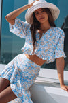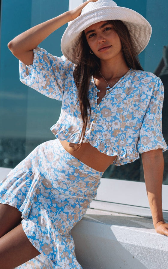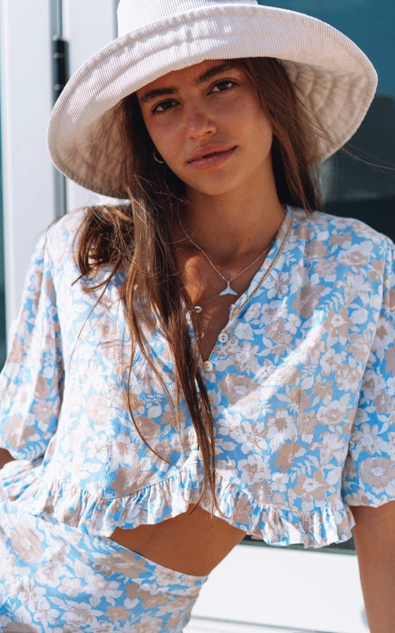 The perfect lightweight, easy to wear blouse of the season. Perfect for the warmer months ahead . Featuring V-neckline and button down front, lace trim detail and feminine frill at base. This is a trans-seasonal piece you will wear all year round paired with your favourite denim or matching Camila Skirt.