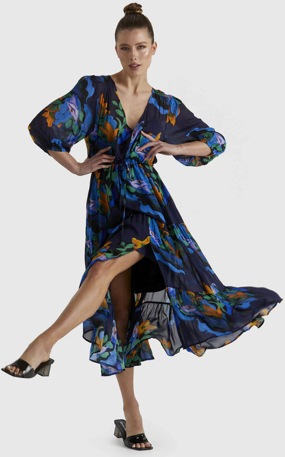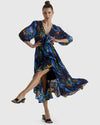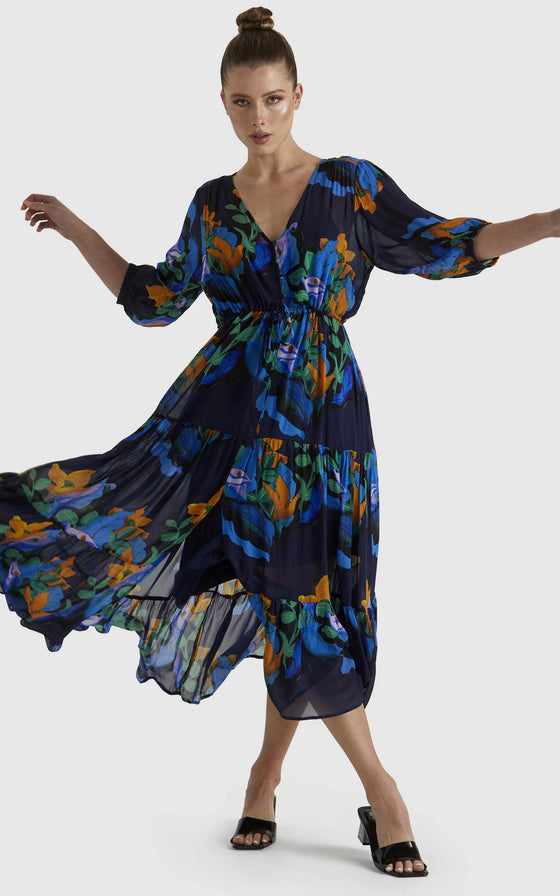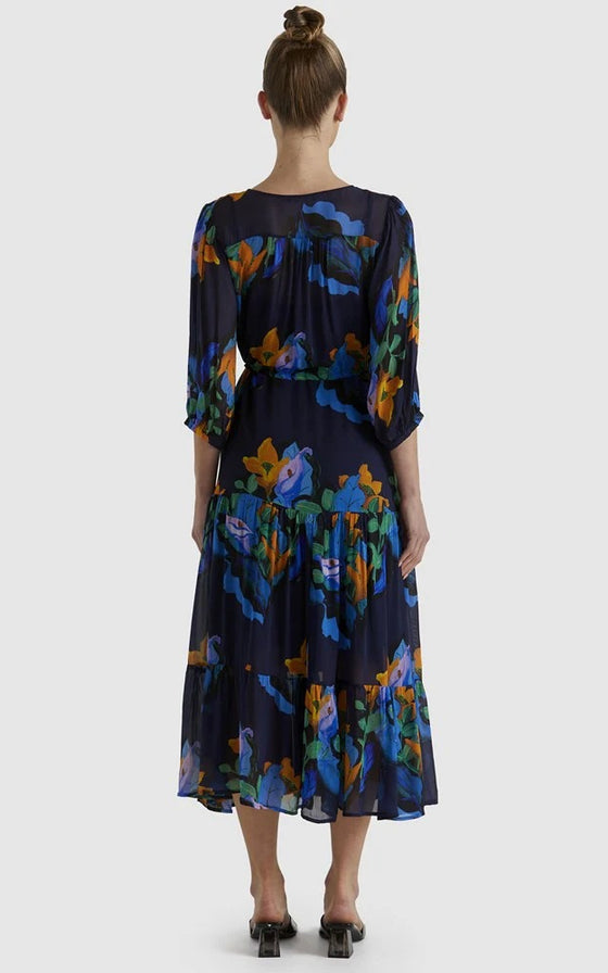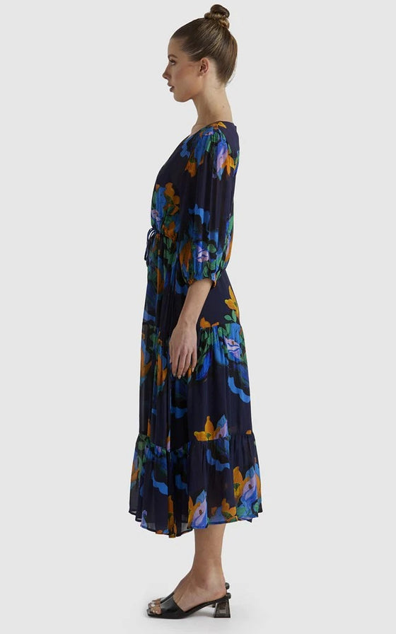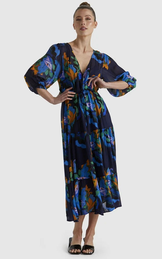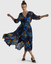 The Twilight Dress combines timeless elegance with practicality, featuring a V-neckline and functional button-down closure. A self-fabric tie belt enhances its flattering silhouette, making it a versatile and elevated choice.
