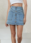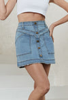 The Zoe mini denim skirt is designed with belt loops and elegant gold buttons at the front. It features practical front pockets and a zip closure at the back, made from denim with a subtle stretch for enhanced comfort.
